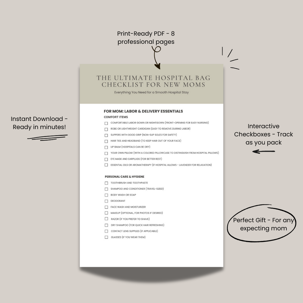 Don't pack your hospital bag in a panic at 2 AM like I did! 😅This comprehensive hospital bag checklist covers everything you need for labor, delivery, and postpartum recovery - including those "wish someone had told me" items that most lists forget.What's Included: